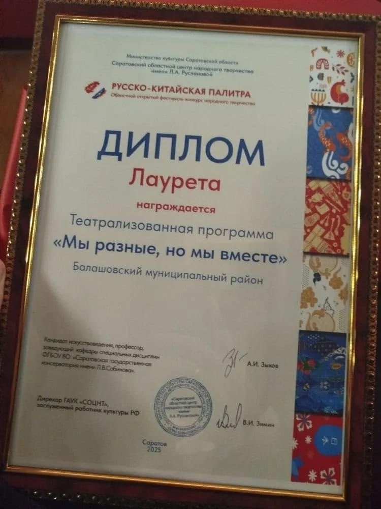 По решению жюри Балашовский район вошёл в пятёрку лауреатов конкурса! Программа «Мы разные, но мы вместе!» получила высокую оценку и заслуженно признана одной из самых ярких и красочных. Это результат большого труда и таланта творческих коллективов нашего района.
