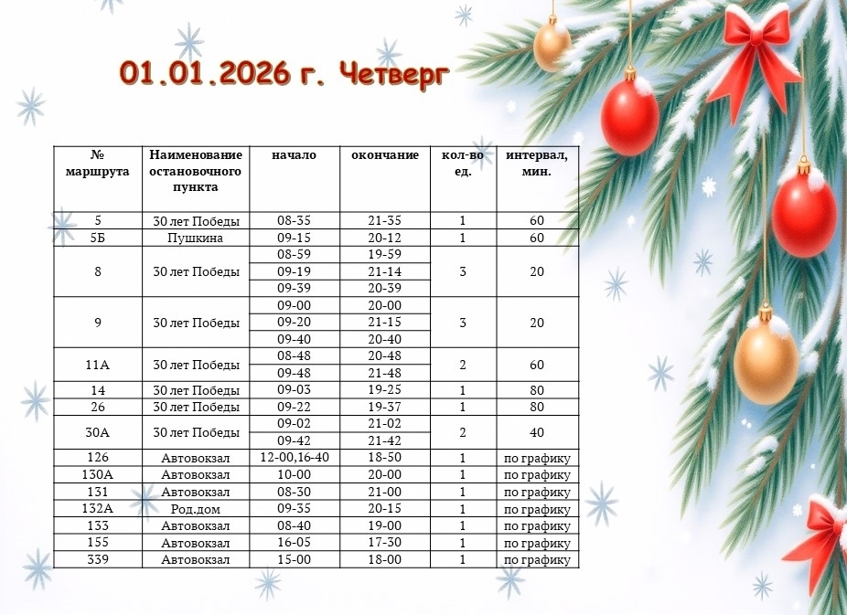 1–4 января 2026 года — автобусы будут курсировать по специальному расписанию, указанному в карточках.